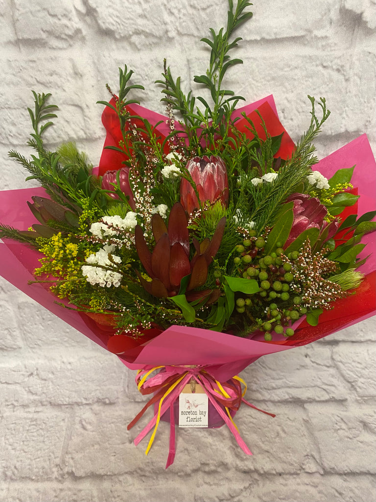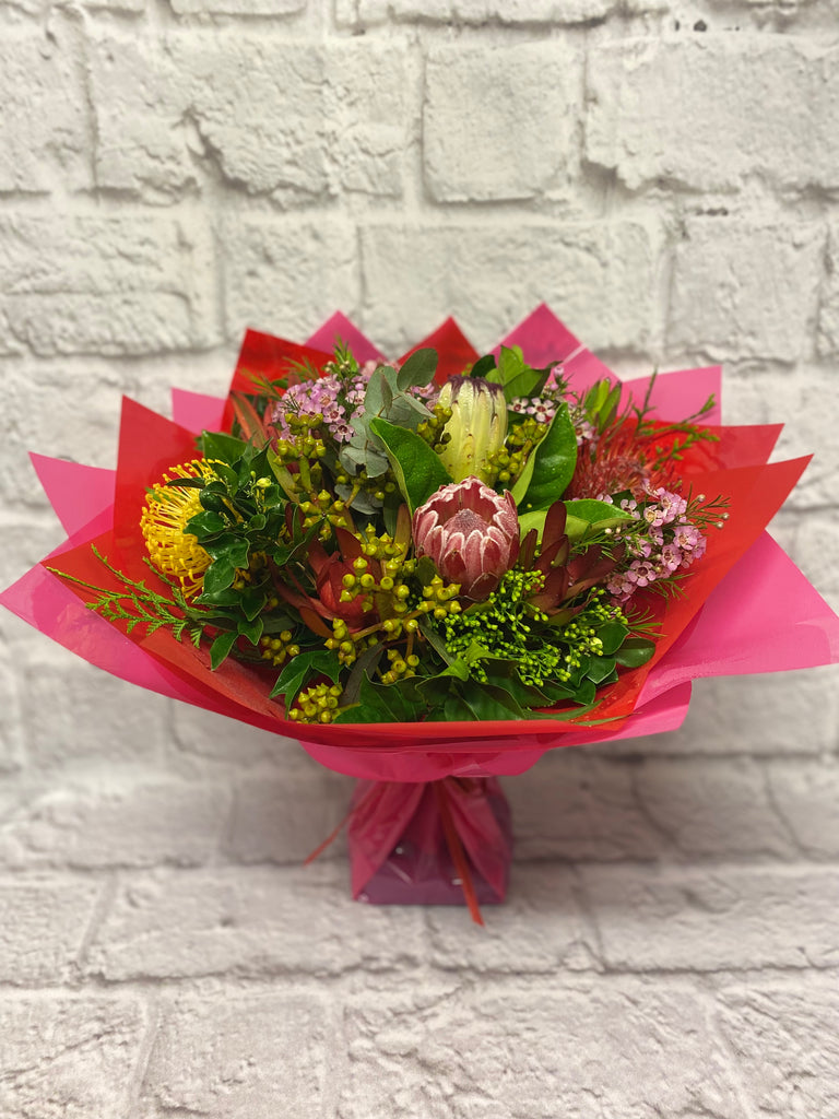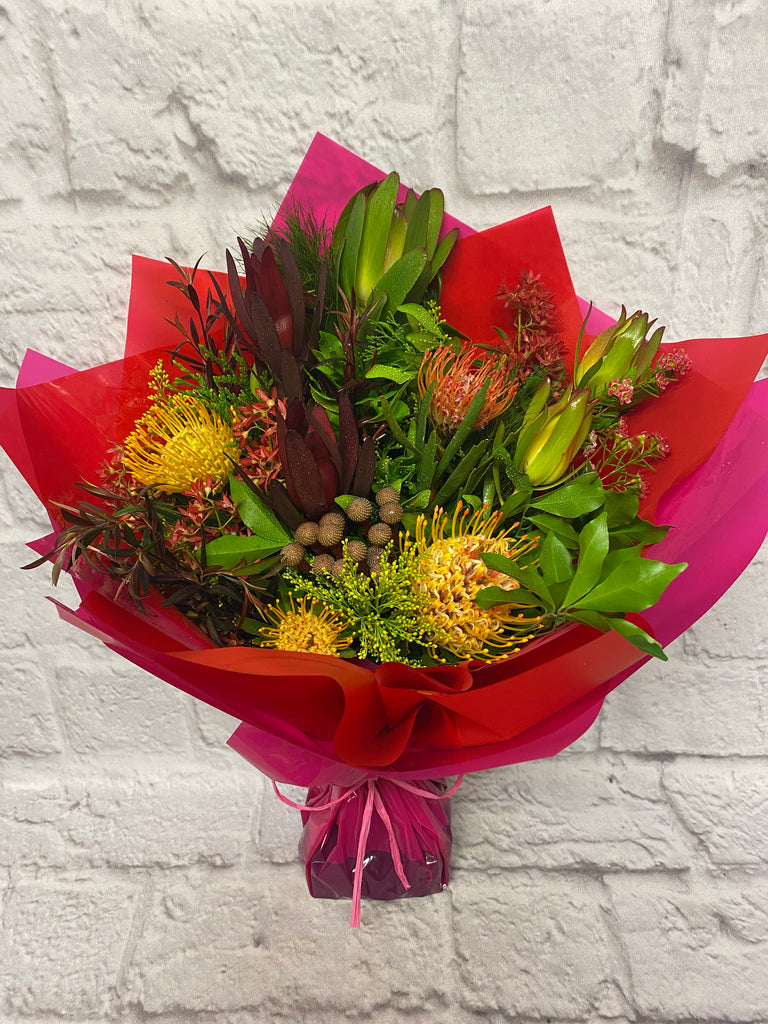 A beautiful mix of Native Blooms, all wrapped up in Bright Papers and finished with a Raffia Bow. We select the finest and freshest Native Flowers & Fillers of the season, and present them in the beautiful Bouquet, suitable for lots of occasions. ** Please know that the variety of Natives, Fillers and Greenery will vary from the photo- it will depend on what is available at the time of your order **